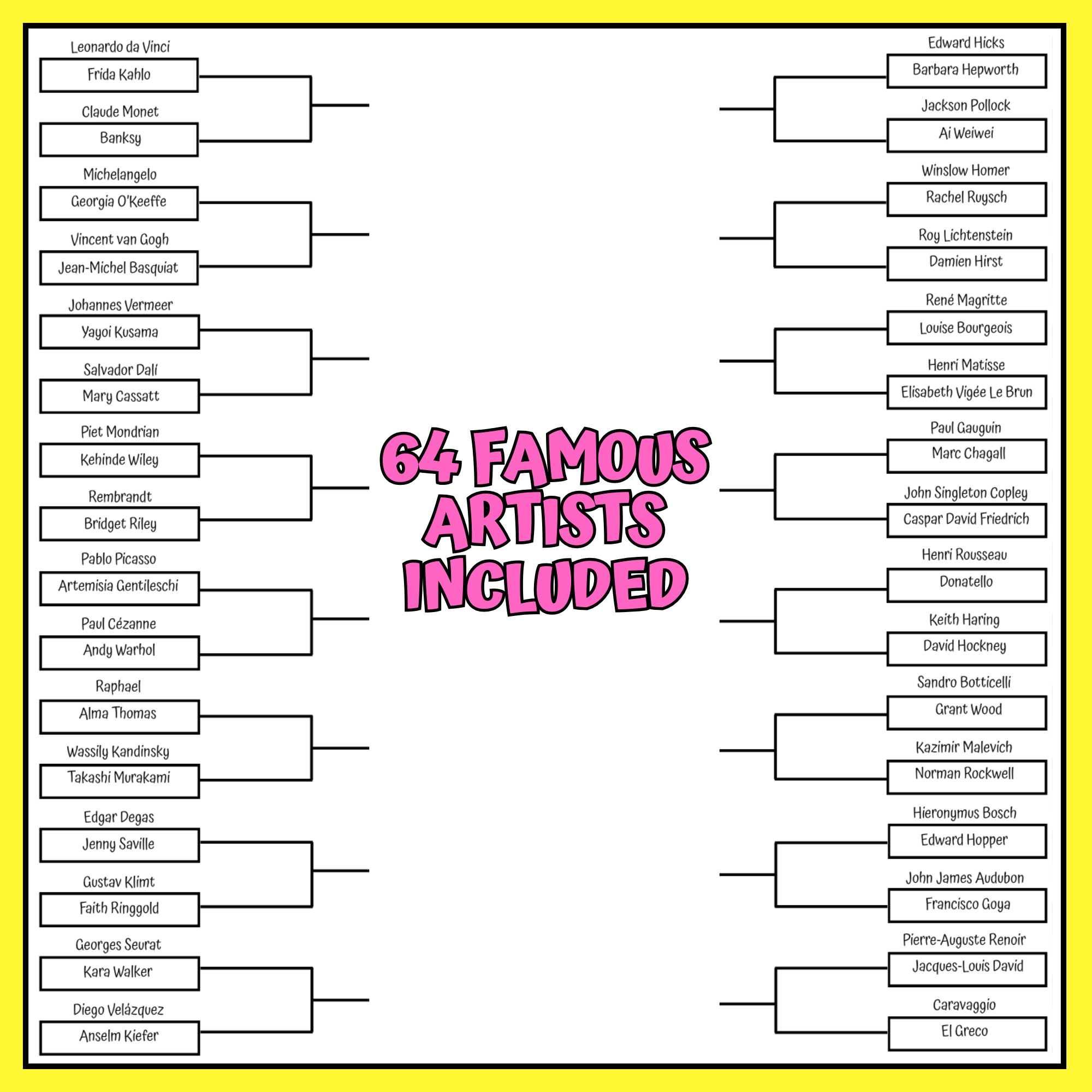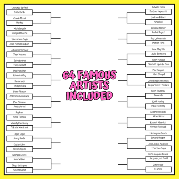 Transform your art lessons with this interactive March Madness artists bracket, perfect for making art history engaging, meaningful, and fun. Students will explore 64 famous artists from a variety of time periods and artistic movements as they compare styles, techniques, and influence in a tournament-style competition.