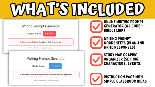 Students can generate a new writing idea instantly using the QR code or link, then use the included pages to plan, organize, and write their response.