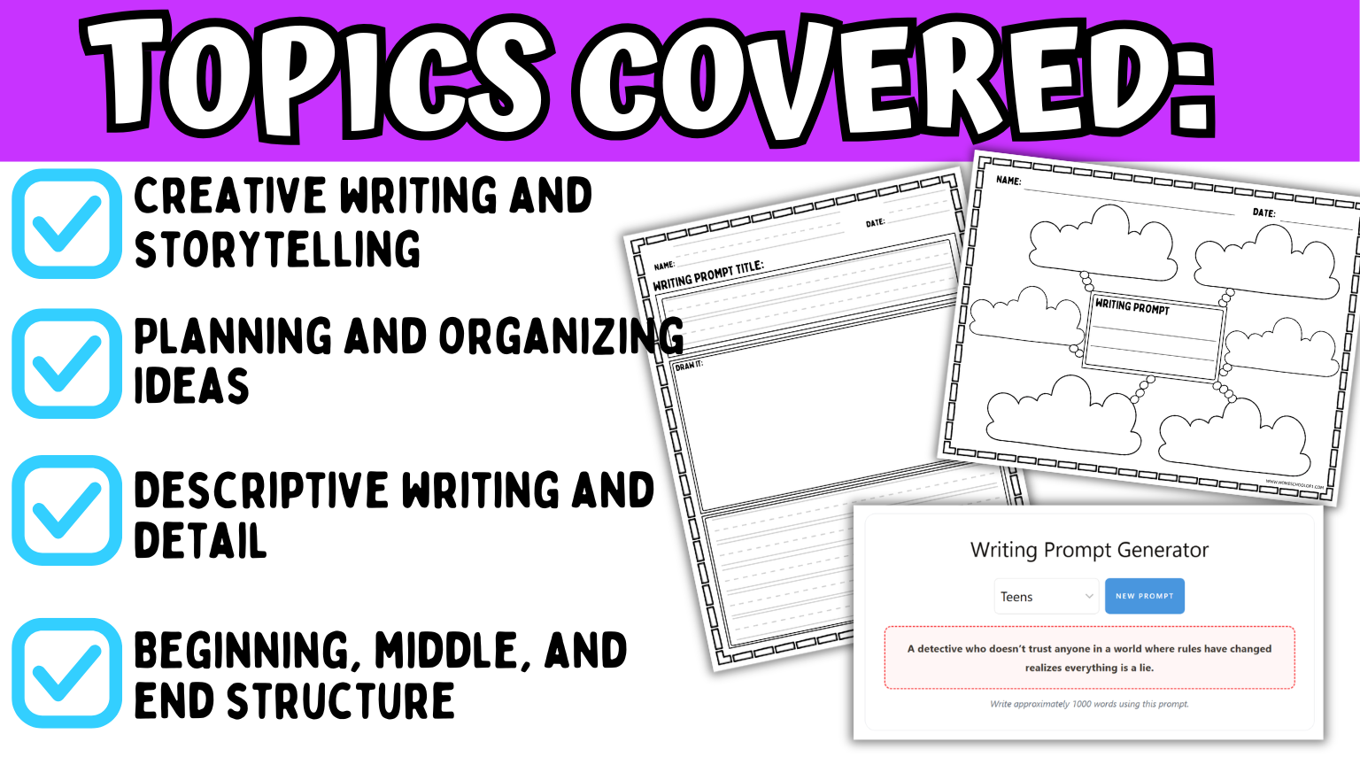 The generator removes the hardest part (getting started), while the worksheets provide the structure needed to actually complete the writing.